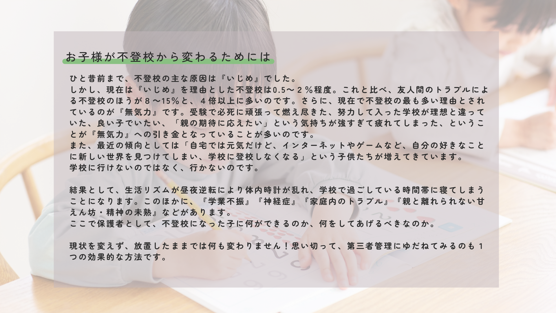 また、家では元気に見えても、ネットやゲームの中に新しい居場所を見つけてしまい、学校へ行く意味を見失うケースも増加しています。その結果、学習が止まるだけでなく、生活リズムが崩れて「昼夜逆転」に陥ってしまうなど、実生活への悪影響も少なくありません。こうした状況を前に、「親としてどう接すればいいのか……」と一人で深く悩まれている保護者様は非常に多いのが現状です。